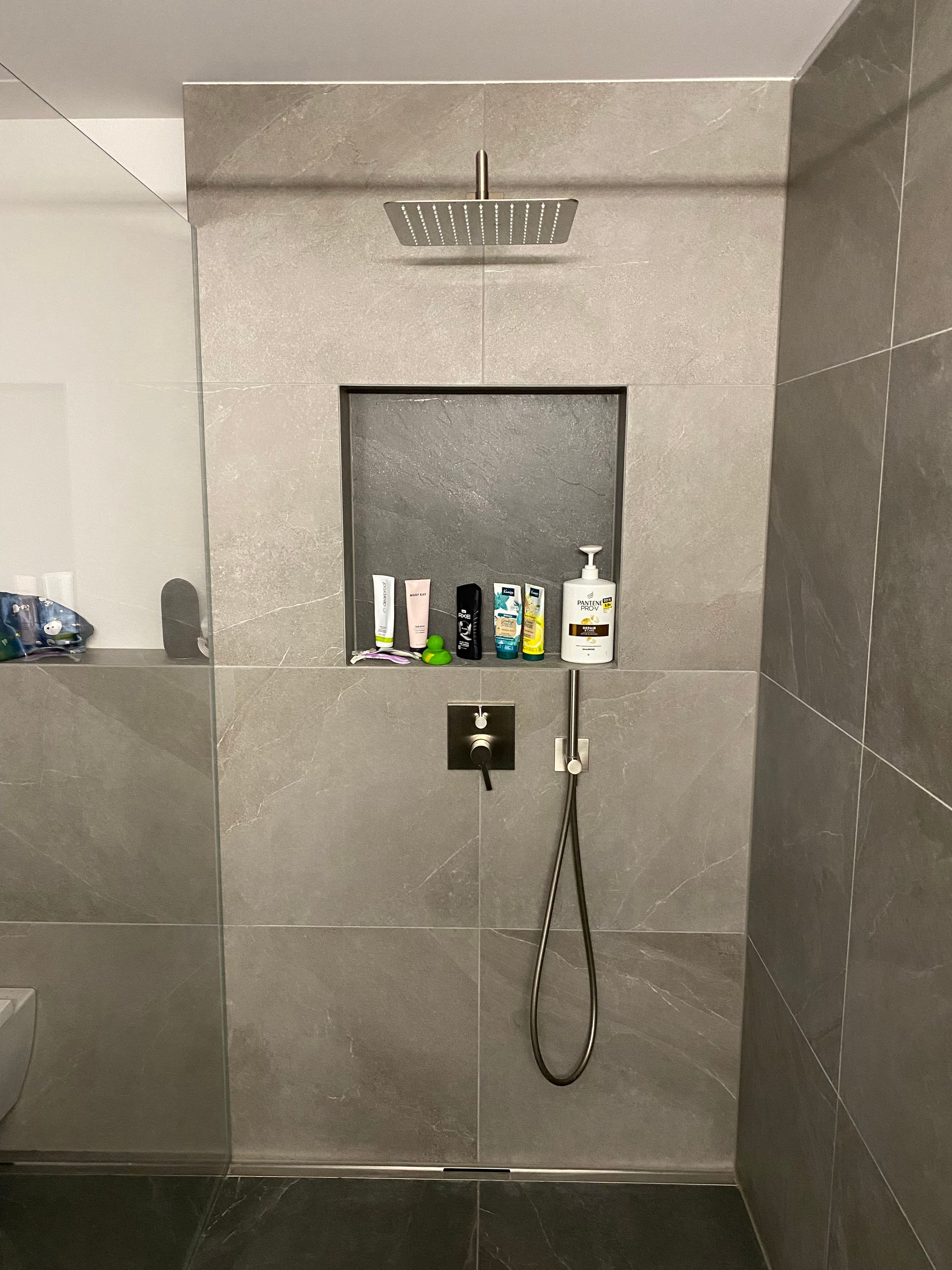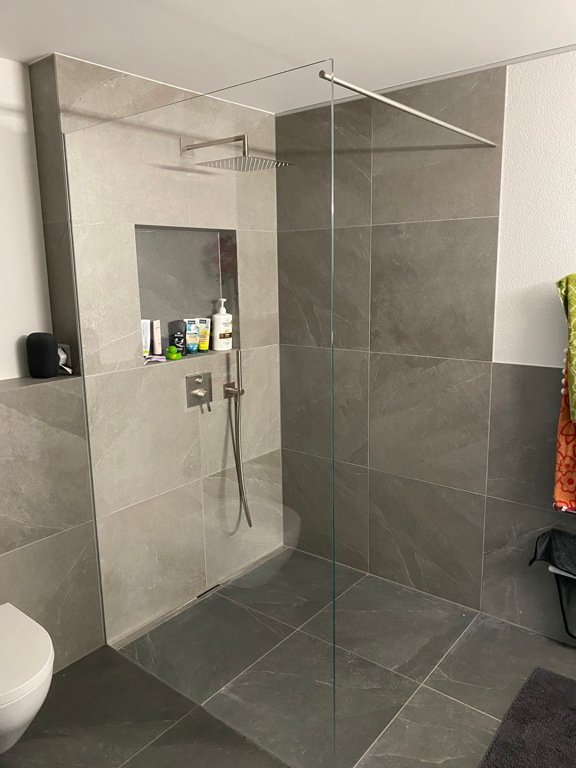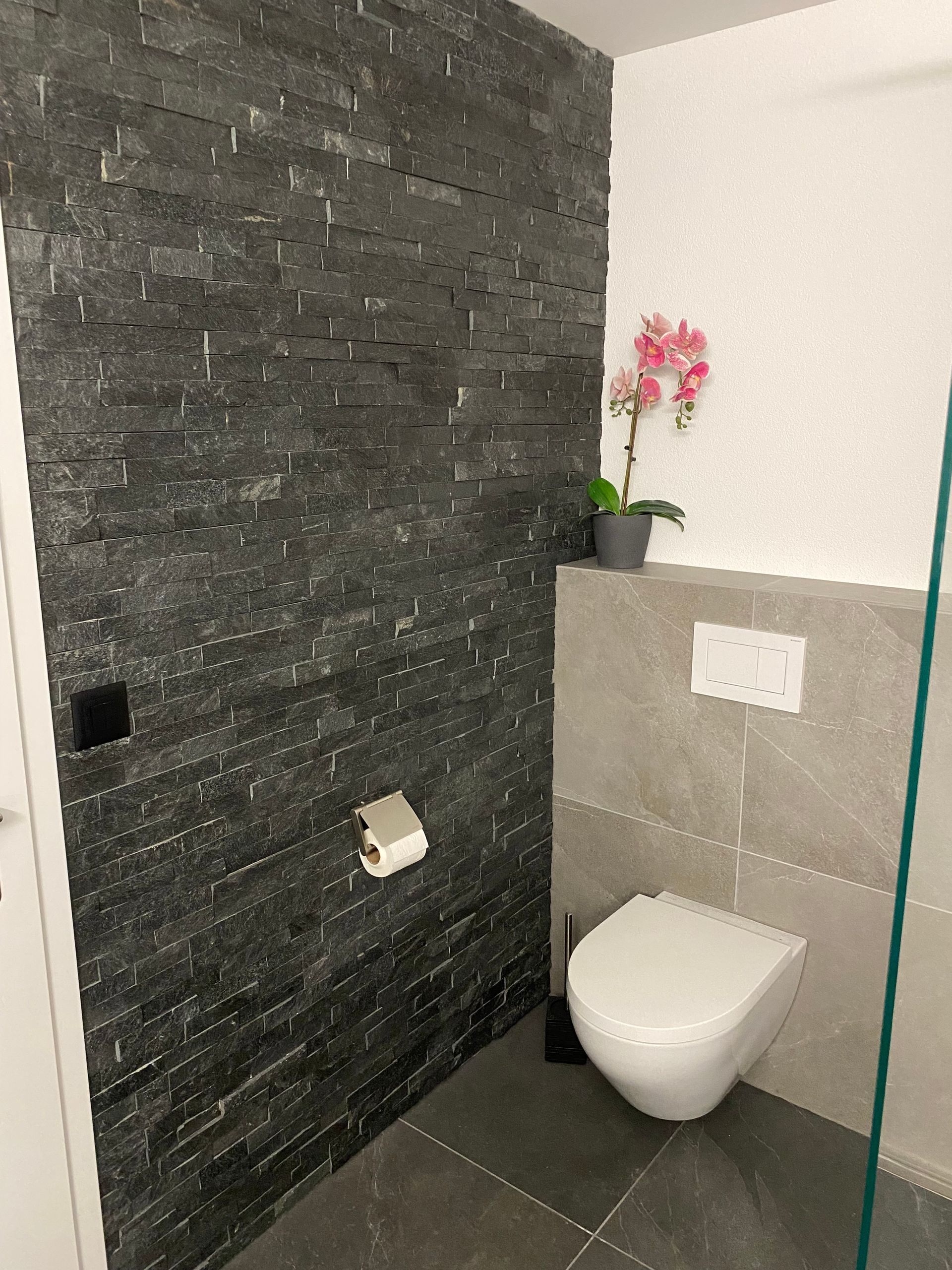 Naturstein‑Verblender und 60 × 60 cm Keramikplatten ergeben im Bad eine elegante Kombination: natürlicher Charakter trifft auf moderne Klarheit. Perfekt abgestimmt entsteht ein harmonischer, hochwertiger Look.